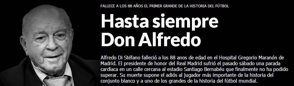 비보가 전해졌다. 전설적인 축구 영웅 알프레도 디 스테파노가 현지시각 2014년 7월 7일 88세의 나이로 세상을 떠났다.