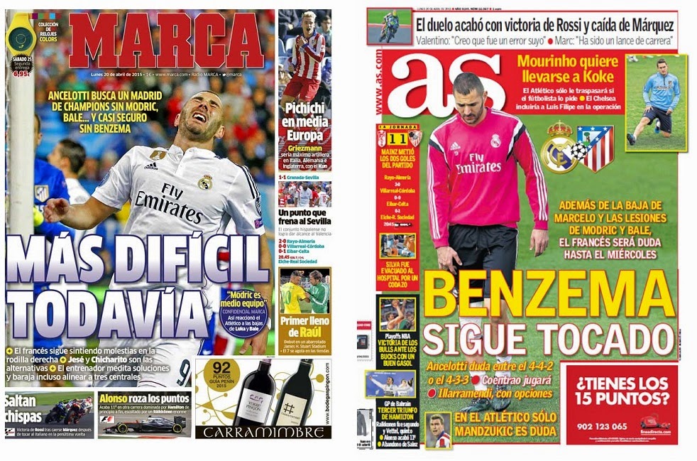 아틀레티코 마드리드와의 챔피언스리그 8강 2차전 결장자가 속출하는 가운데, 카를로 안첼로티 감독은 벤제마마저 잃을 위기에 처했다. MARCA와 AS는 금일 보도를 통해 무릎 부상으로 말라가 전에 결장한 벤제마가 오는 아틀레티코 전까지 회복 여부가 불투명하다며 결장 가능성이 유력한 것으로 전망했다.