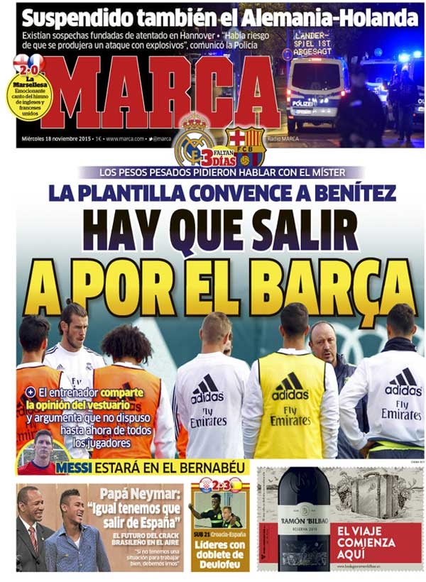 엘 클라시코를 앞둔 주변의 전초전이 후끈하다. 마르카(MARCA)는 인쇄본 커버를 통해 발데베바스에서 선수단 대표와 라파 베니테스 감독이 회담을 가졌고, 엄숙하고 진중한 분위기 속에서 최근 팀의 상황 등에 대해 논했다고 보도했다.