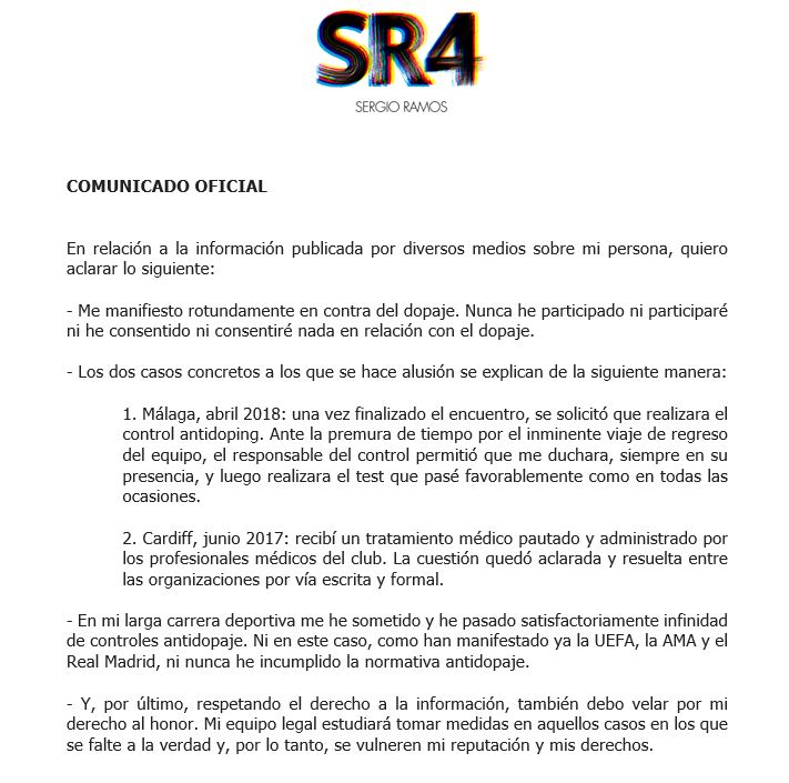 세르히오 라모스(32)가 SNS를 통해 성명문을 발표했다.