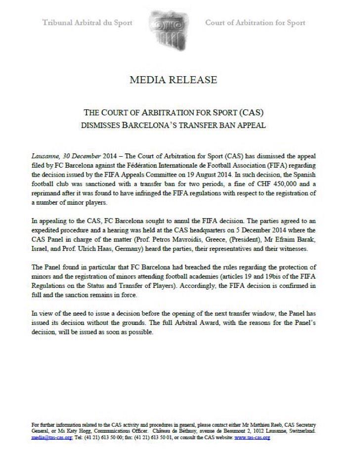 바르샤가 CAS(스포츠중재재판소)에 제기한 FIFA의 징계 처분에 대한 항소가 끝내 기각됐으며
