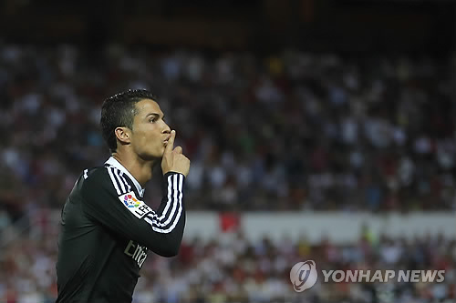↑ '쉿 우리가 최고야' 레알 마드리드의 공격수 크리스티아누 호날두.(AP=연합뉴스DB)