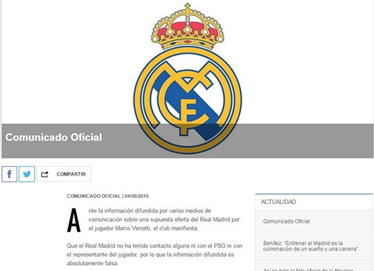 레알 마드리드는 공홈피셜을 통해 우리 팀의 베라티 영입설은 거짓이라고 밝혔다. 이미 다른 매체에 의해 자세한 제시금액과 밀란에서 만났다는 등 많은 소식이 전해졌지만 이를 모두 부인했다.