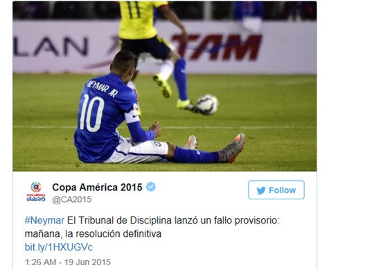 비매너 퇴장으로 1경기 징계를 받은 네이마르가 추가 징계를 받을 수도 있다. 금요일 코파 아메리카 조직위원회는 회의를 열 예정이며 비신사적 행동에 대한 징계를 결정할 것이다. 브라질의 전설적인 축구선수 호나우두는 브라질 유니폼이 아깝다며 네이마르를 강력히 비판했다.