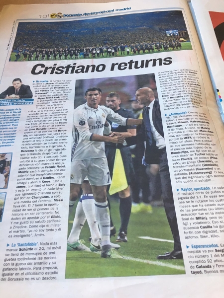 도르트문트전 이후 마르카는 호날두가 시즌 최고의 퍼포먼스를 보여줄 수 있었던 이유에 대해 설명했고 아스에서는 보시다시피 "Cristiano retuns"라는 기사를 실었습니다. 이렇게 호날두에 대한 현지 여론은 다시 좋아지고 있는 모양새입니다. 근데 정작 한국에서는 그것도 어제 훈련 영상도 아닌 도르트문트전 하루 전 날 훈련 영상으로 인성쓰레기라며 까이고 있으니 답답할 따름입니다.