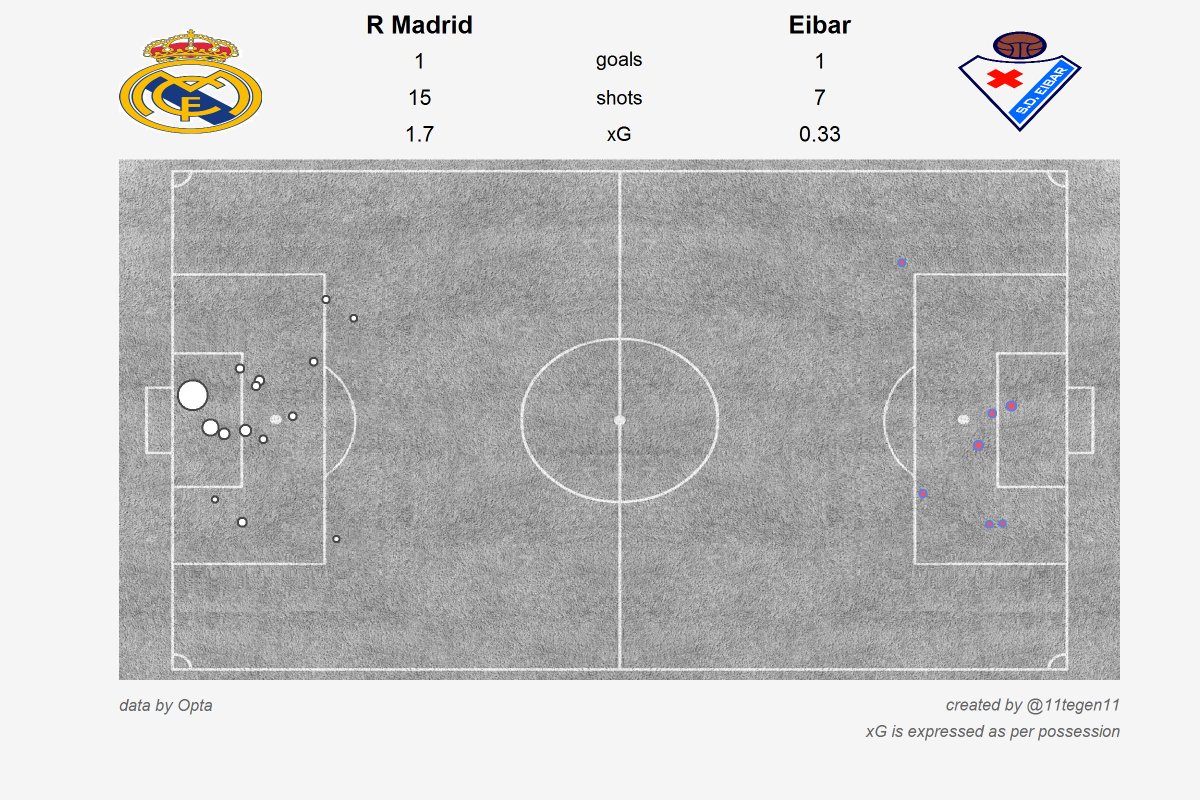 위의 그림에서 볼 수 있듯이, 레알 마드리드는 완벽히 에이바르를 능가했다. 마드리드의 가장 큰 고민은 심각한 골 결정력에 있었다. 호날두는 대부분의 기회를 놓쳤고, 벤제마와 베일의 탭인도 막혀버렸다.