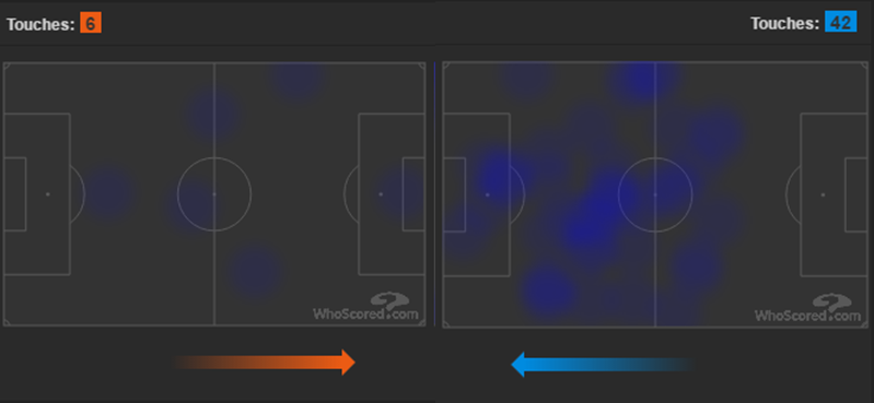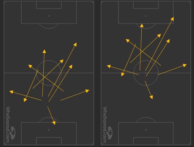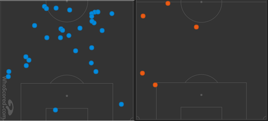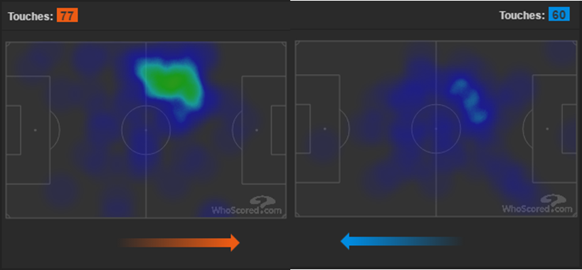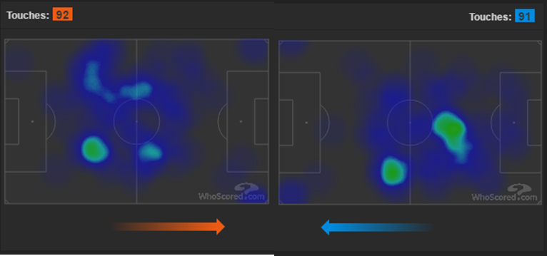 통계 데이터 상으로 코바치치는 후방에서 더 많은 터치를 기록했습니다. 패스 길이 없음 나한테 달라는 겁니다. 덕분에 크로스가 위에 있어도가져갈 수 있는 안정적인 패스 선택지가 되어 주었습니다. 활동영역 역시 크로스의 바로 옆이었고, 수비적으로 많이 뛰어주었고요.