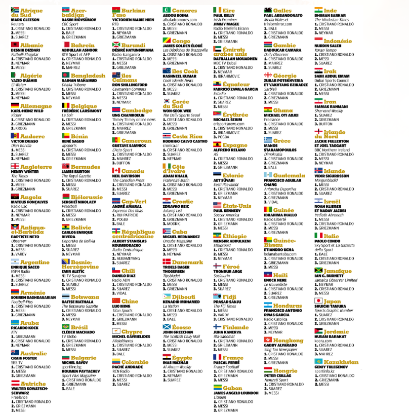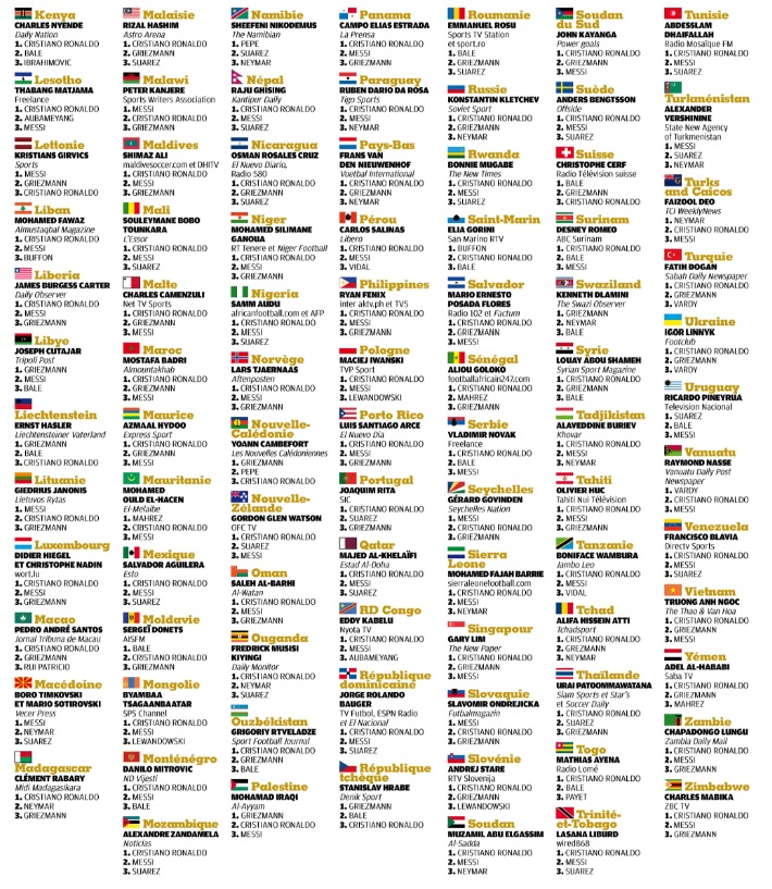 라그 2016.12.13*안도라, 볼리비아 마케도니아 투르크메니스탄 기자 양심없네요. 1위 2위 3위가 메시 수아레즈 네이마르라니. 안도라야 사실 꾸레국에 가까우니 그렇다쳐도. 카보베르데 기자도 좀. 파트리시우 포그바 베일이라니(....) 이주한 포르투갈 인일거 같네요.