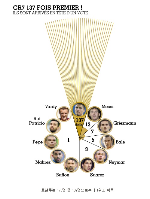 김자파 2016.12.13역사상 가장 불공정한 발롱도르답게 1위표가 몰려있네요.