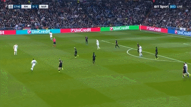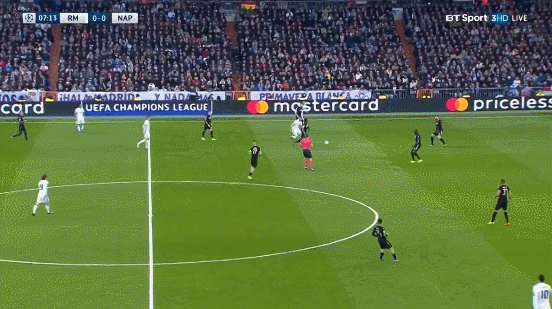 베니테즈 시절에 보여준 카세미루의 킥은 수준급입니다. 저렇게 보내도 성공률이 꽤 높다는 걸 알 수 있습니다. 지단 감독은 카세미루에게 횡으로, 일단 빠르게, 길게 날릴 것을 주문한 것으로 보입니다. 덕분에 나폴리 공격수들이 압박하기 전에 빠르게 사이드로 보낼 수 있었지요.