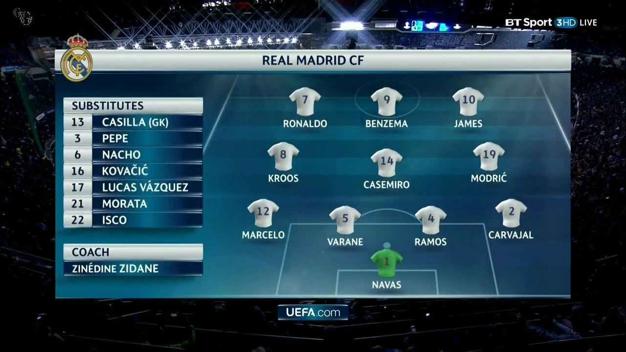 이날 지단 감독은 하메스를 선발로 내보냅니다. 크로스-모드리치-카세미루 3명을 쓰는 전술에서는 속도와 드리블에 강점이 있는 선수들을 투입하던 패턴에서 벗어난 겁니다. 카세미루가 패스 플레이에 도움이 되지 못하기에 크로스와 모드리치가 공격진과 가까운 곳에서 공을 받기 힘듭니다. 그래서 1:1에서 강점을 보이는 선수들을 선호해 왔던 건데, 바스케스가 있는데도 하메스 투입을 강행한 것은 체력 안배를 위해서였거나, 다른 노림수가 있다는 뜻으로 여겨졌습니다.