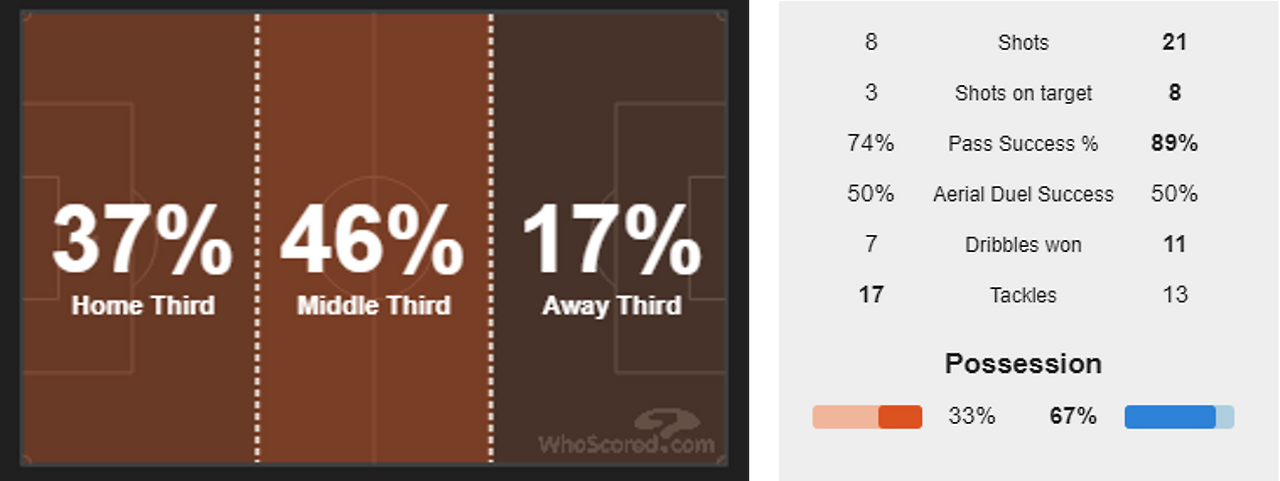 높은 점유율, 3배가 조금 안되는 슈팅, 그리고 공 자체가 레알 마드리드 진영에서 거의 돌지 않은 것을 알 수 있습니다. 반코트 경기에 가까운 수준으로 공을 잡고 신나게 때렸다는 이야기입니다. 전체적인 진행은 그리 되었다는 이야기고, 이제 자세한 내용으로 들어가겠습니다.