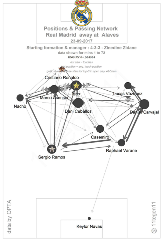 10분 뒤부터 알라베스는 경기 내내 수세에 몰립니다. 특히 레프트에서 마드리드가 포지션에 변화를 줬기 때문이라고 봅니다. 여기서 보면 아센시오가 오히려 후방에 머물러 있으며, 나초가 카르바할처럼 멀리까지 진출한 모습을 볼 수 있었습니다.