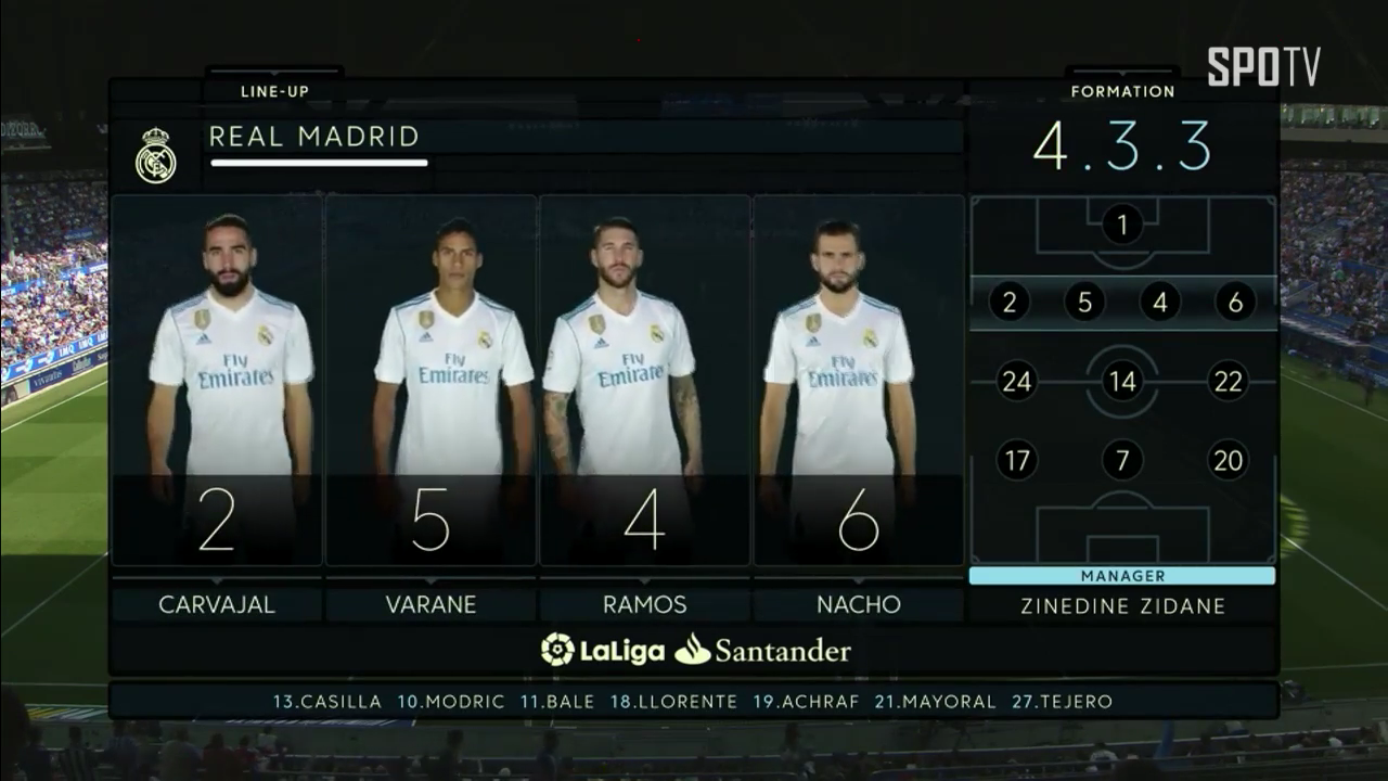 선발 라인업은 이러합니다. 모드리치 크로스를 쉬게 하는 대신, 이스코와 세바요스가 선발로 나섭니다. 카세미루를 투입한 것은 팀 중심이 앞으로 쏠려도 역습 차단을 해줄 선수가 필요했기 때문이고요. 공격진으로 아센시오, 호날두, 그리고 바스케스가 투입되었습니다. 도르트문트 전을 대비한 로테이션 차원에서 베일을 쉬게 한 것으로 보이며, 지단 감독은 호톱에 대한 믿음을 버리지 않은 것이 확실해 보입니다.