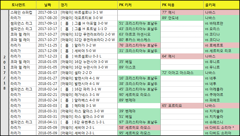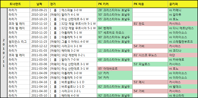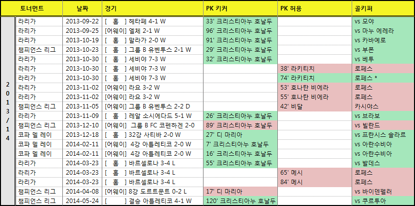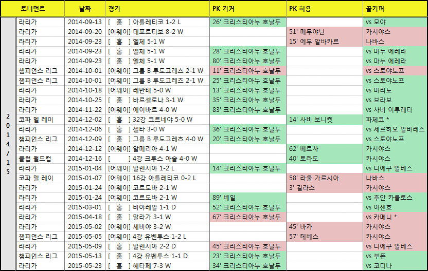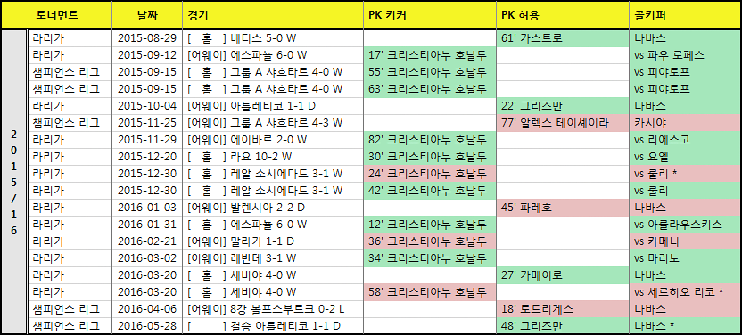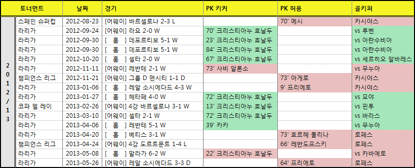호날두가 홀로 4개를 실축하였고, 현재 팀 말라가를 상대로 PK 세 개 연속 실축이라는