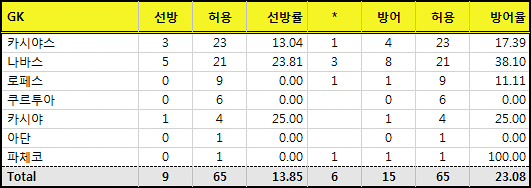 ! 골키퍼 선방률 "허용"란의 숫자는 실점한 PK를 비롯