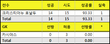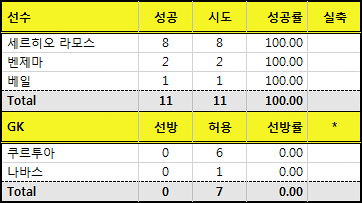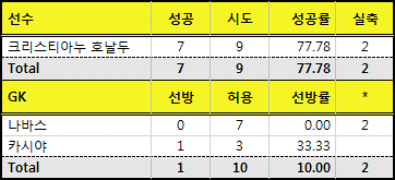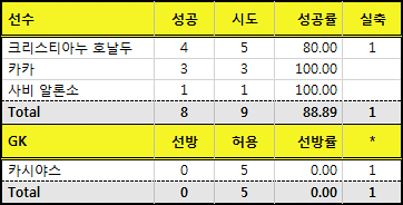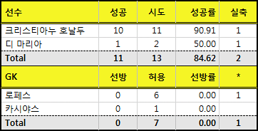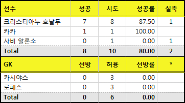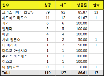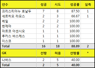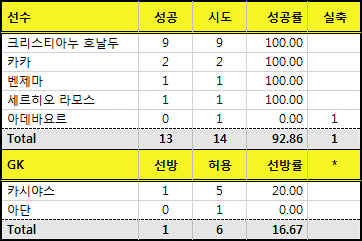 호날두와 라모스가 각각 8개, 2개씩 성공시키며 성공률도 100%