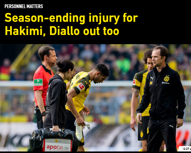 도르트문트에 임대간 하키미가 볼푸스부르크와의 경기에서 중족골이 부러지는(broken metatarsal) 부상을 입었다는 소식입니다.