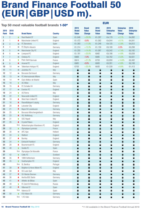 - '2019년 가장 가치있는 축구 구단 50'에서 프리미어리그는 17팀이 들어갔고 브랜드 가치의 43%로를 차지하고 있다. 이는 순위를 장악함에 따라 유럽 주요 시장에서 가장 널리 퍼진 리그라는 것을 알 수 있다. 분데스리가는 13팀이 들어갔지만 브랜드 가치 합계는 라리가에 뒤진다.