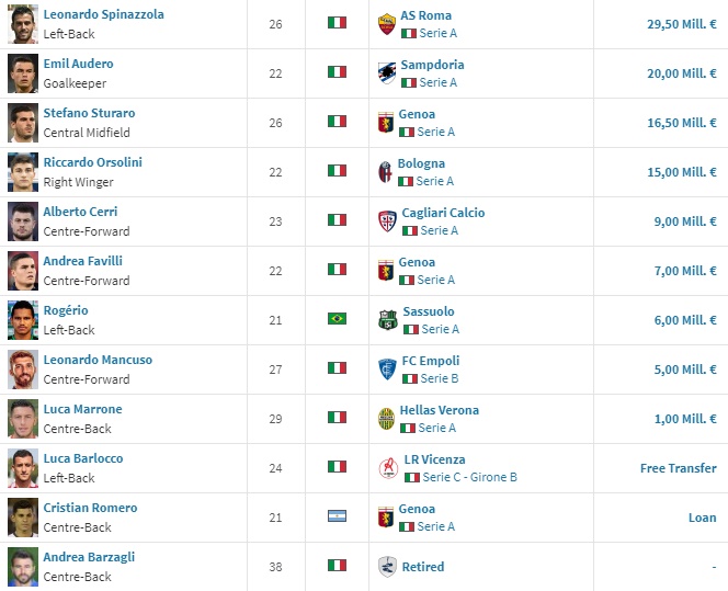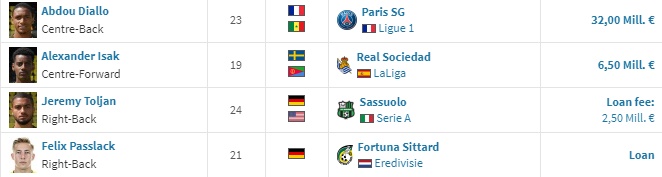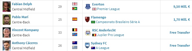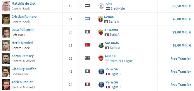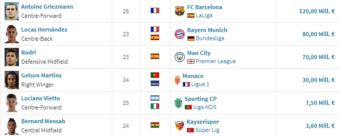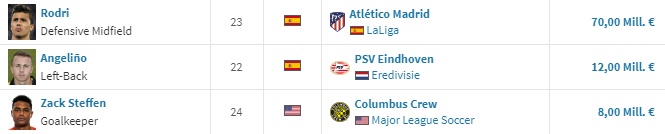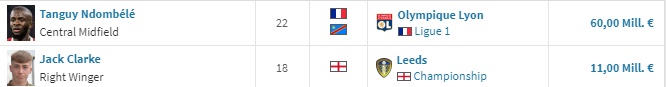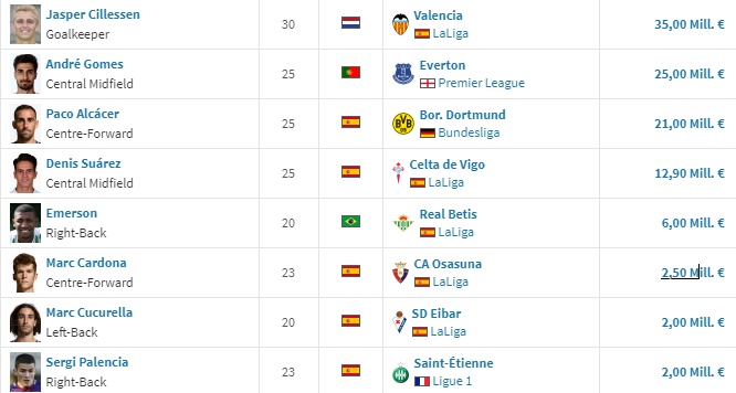 기준은 트랜스퍼마켓, 단위는 유로입니다.