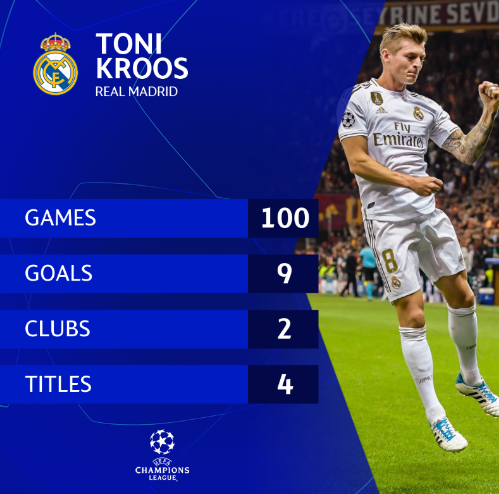 - 토니 크로스는 챔피언스리그 역사상 다섯 번째로 100번째 경기에서 득점을 기록한 선수다. (앙리, 즐라탄, 피를로, [날])
