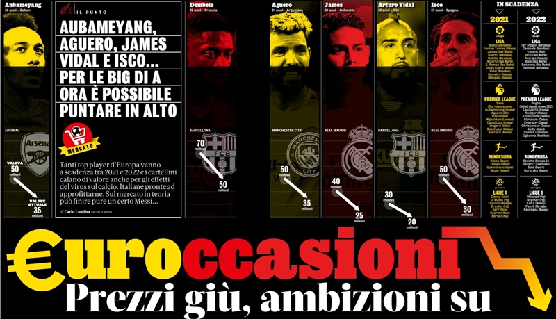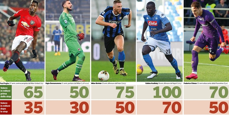 각 리그는 코로나로 인해 중단되었기 때문에 그전처럼 이적료를 지불할 능력을 상실했음. 그러므로 계약만료를 앞둔 선수들의 가치도 영향을 받을 것이다. 해당 선수들에 관심이 있는 클럽의 입장에선 훨씬 더 저렴해졌기 때문에 오히려 찬스가 생겼을지도. 모든 클럽들이 수익에 큰 타격을 받았고 이적 시장 판도 역시 크게 요동칠 것이다. 상당수 선수들의 이적료는 크게 하락할 것으로 보임