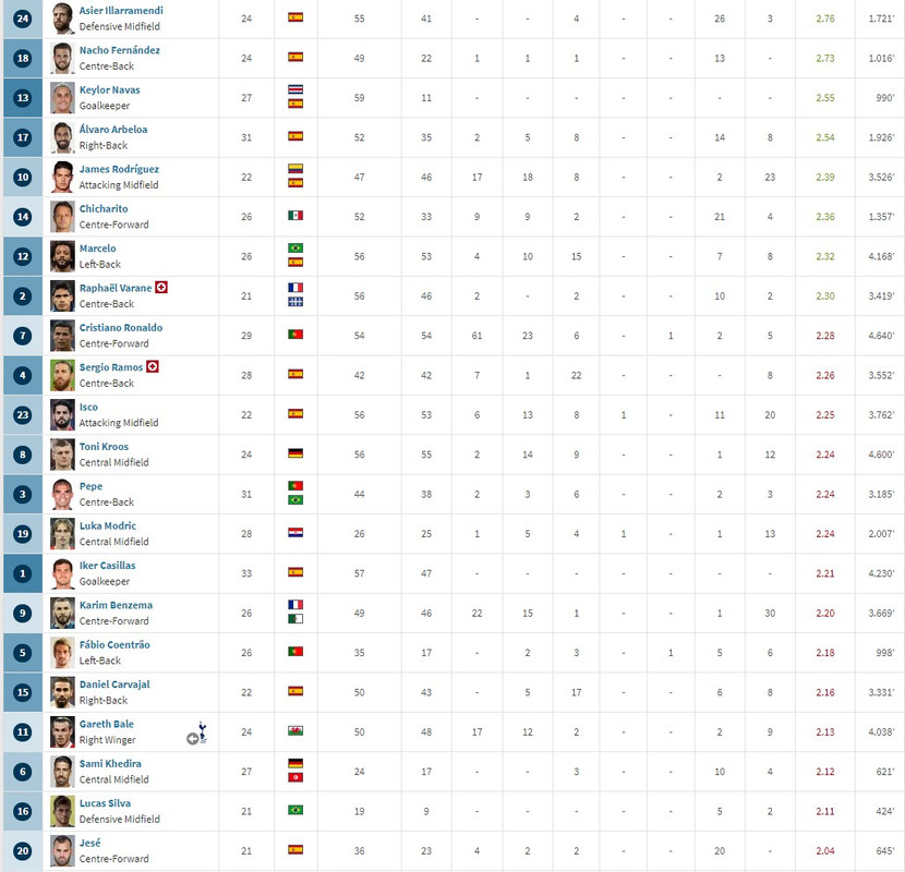많은 경기를 뛰길 원하는 호날두를 제외하더라도, 크로스나 마르셀루 등은 사실 꽤나 많은 경기를 소화하긴 했습니다. 나름 갈아 썼다는 지난 시즌(20/21) 52게임을 소화했고, 3500분 이상을 출전한 선수가 4명인데 반해, 14/15는 59경기를 소화했고, 3500분 이상을 소화한 9명이나 됩니다. 물론 클럽 월드컵 여타 경기로 인해 7경기를 더 소화한 시즌이기 때문에 7천분 가량을 선수단이 더 뛰어야했고, 평균 300분, 주전 선수라면 5~700분을 더 소화해야만하는 셈이 되서 그걸 감안하면 지난 시즌과 비슷해지긴 합니다. 비슷한 경기 수를 소화한 시즌을 찾아보면 17/18 시즌 62게임 소화로 8명이 나오고, 16/17 시즌은 60게임에 참여해서 6명이 나오네요.