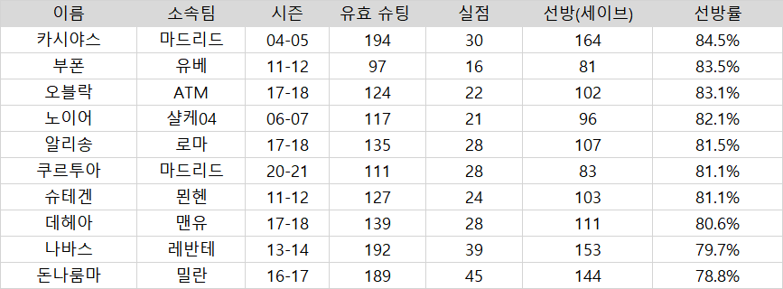 보시면 아시겠지만, 첫 번째 표는 10명의 골키퍼의 가장 선방률이 높았던 시즌을 표시한겁니다. 카시야스는 탑 골리의 커리어 하이라고 보통 일컫는 80%를 넘어 84%대를 유일하게 기록하고 있습니다.