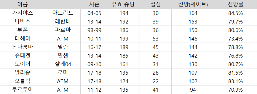단순히 말로만 잘한다 잘한다 하는게 아니라 현 시대 탑 골리 10명의 커리어 하이 시즌과 한번 비교해볼게요. 현재의 최고 골키퍼로 꼽히는 선수들과, 골리 계의 레전드 부폰을 추가해봤습니다. 쿠르투아, 알리송, 데헤아, 나바스, 부폰, 노이어, 카시야스, 돈나룸마, 슈테겐, 오블락까지 해서 총 10명을 비교해볼게요. 풀시즌이 아닌 시즌과, 5대 리그 밖의(쿠르투아의 벨기에 기록 정도) 기록은 제외했습니다.
