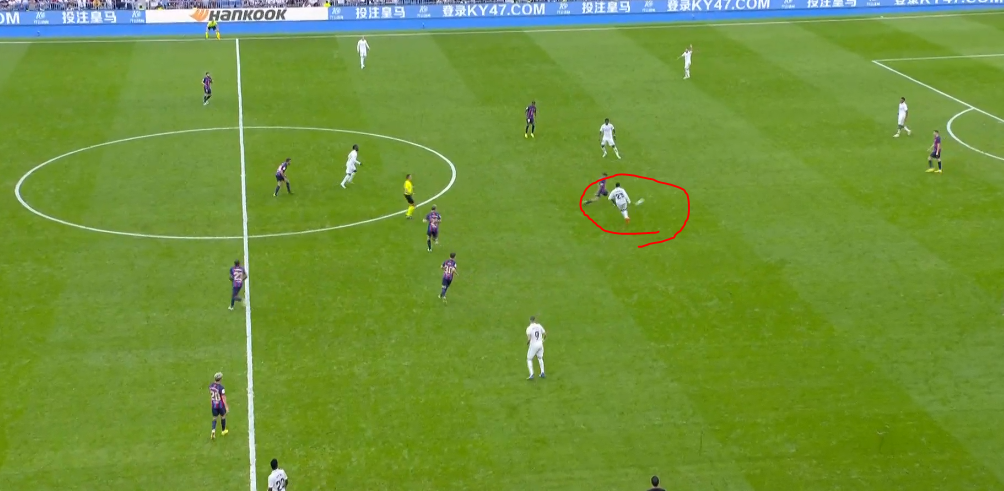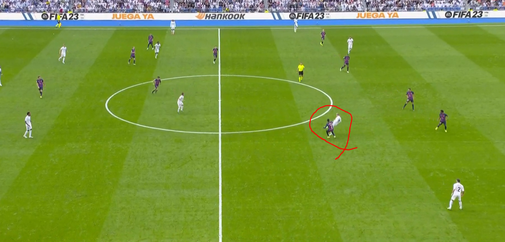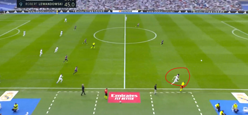 발베르데가 표면적으로는 우측 윙어로 나오지만 수비시에 거의 오른쪽 수비수처럼 수비가담을 해줍니다. 그래서 카르바할이 중앙쪽 수비를 좀 더 신경쓰게 됨으로써 바르셀로나는 더욱 더 레반도프스키로의 볼 투입이나 중앙쪽으로의 공격 작업을 하기가 어렵게 됩니다.