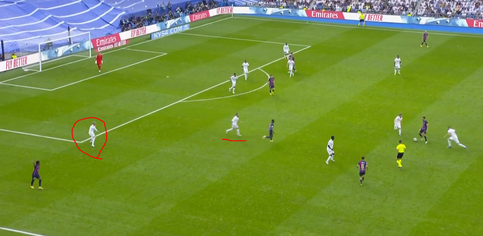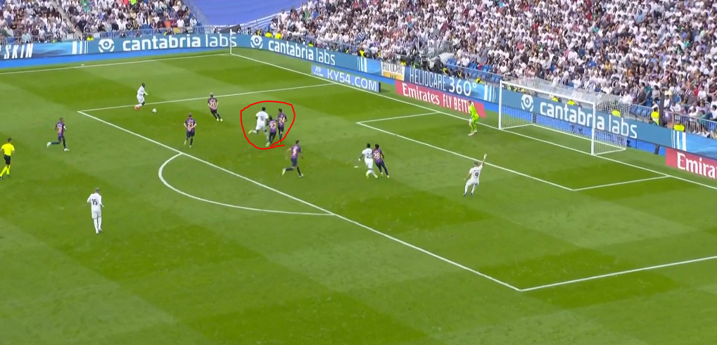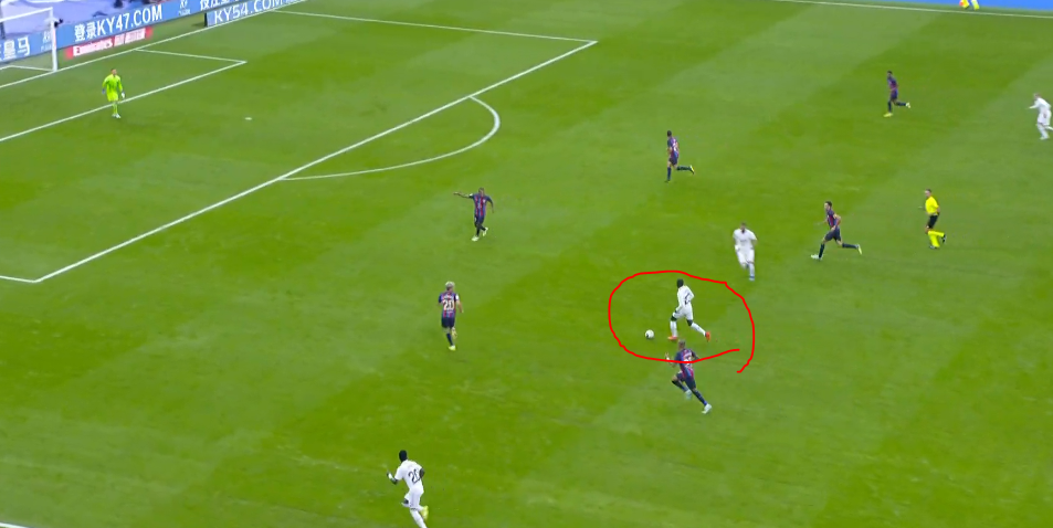발베르데는 당연히 우측 윙어의 역할도 수행해 줍니다. 발베르데의 스프린트는 최상급이라 한번 속도가 붙으면 막기가 상당히 힘들죠. 이 장면도 다른 선수였다면 볼 소유권을 가져오지 못했을텐데, 발베르데는 결국 자신의 공으로 만듭니다.