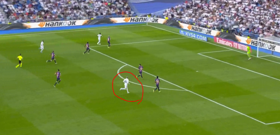 벤제마가 측면으로 빠지자 발베르데가 전방 공격수처럼 자리를 메우는 모습니다. 캡쳐 장면이라 더 많은 장면을 보여드리지 못하는게 아쉬울 정도로 현재 레알의 전술에서 발베르데가 차지하는 영향력은 엄청나다고 생각됩니다. 수비, 중원, 공격까지 사실상 우측면에서 시작하여 공수양면 모두에 도움을 주는 선수가 바로 발베르데입니다.