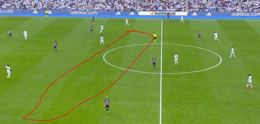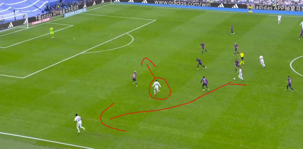 멘디가 이렇게 하프스페이스로 움직임을 가져가다 보니 비니시우스에게 공간이 많이 나는 효과를 얻었습니다. 이것이 안첼로티가 일부러 의도한 움직임 인지는 이후 경기들을 지켜봐야겠으나 앞으로도 지속적으로 활용할만한 가치가 있는 움직임이라고 생각됩니다.